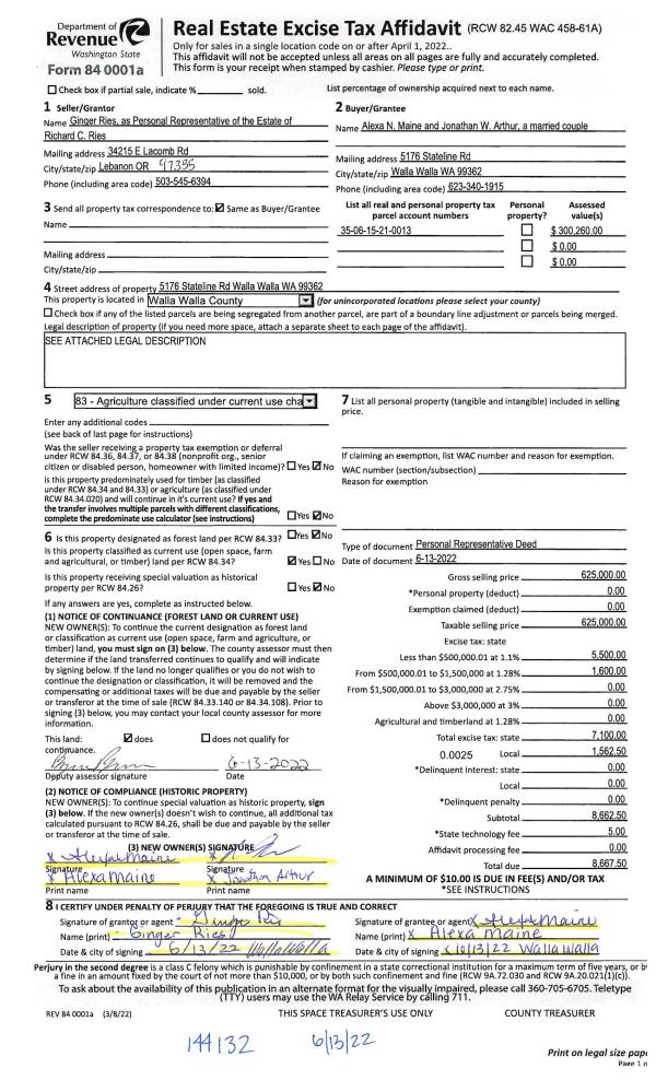 | 1 | 06/13/2022 | DPR | DEED OF PERSONAL REPRESENTATIVE | RIES RICHARD C ESTATE OF | MAINE ALEXA N & JONATHAN W ARTHUR | | | $625,000.00 | 144132 | 2022-05023 |