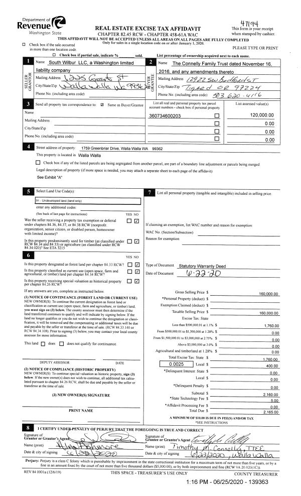 | 1 | 06/25/2020 | SWD | STATUTORY WARRANTY DEED | SOUTH WILBUR LLC | CONNELLY FAMILY TRUST | | | $160,000.00 | 139363 | 2020-05861 |