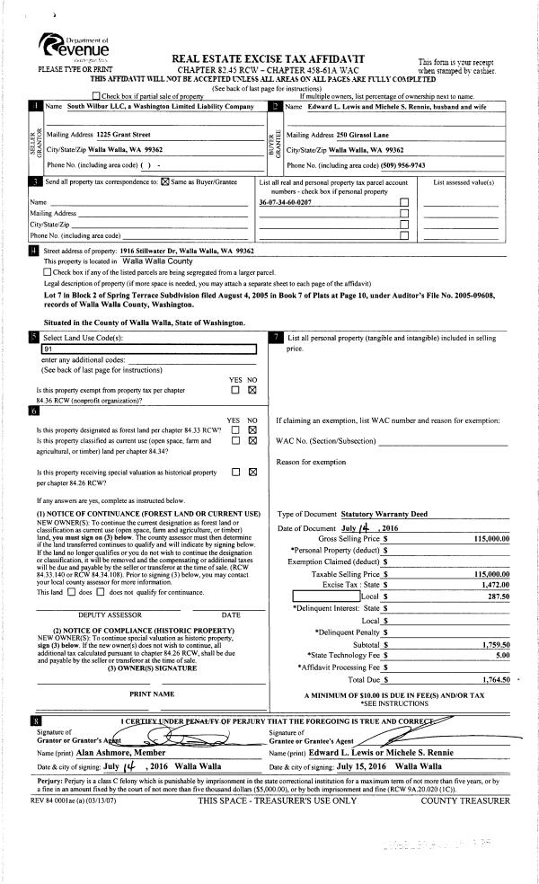 | 1 | 07/15/2016 | SWD | STATUTORY WARRANTY DEED | SOUTH WILBUR LLC | LEWIS EDWARD L | | | $115,000.00 | 130631 | 2016-05526 |