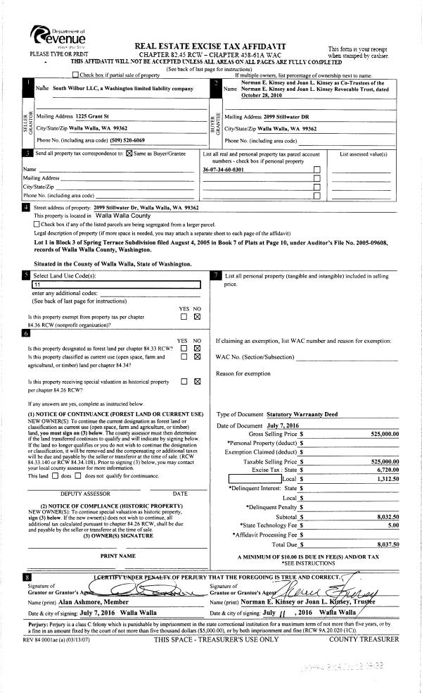 | 4 | 07/12/2016 | SWD | STATUTORY WARRANTY DEED | SOUTH WILBUR LLC | NORMAN E KINSEY & JOAN L KINSEY REVOCABLE TRUST | | | $525,000.00 | 130594 | 2016-05352 |