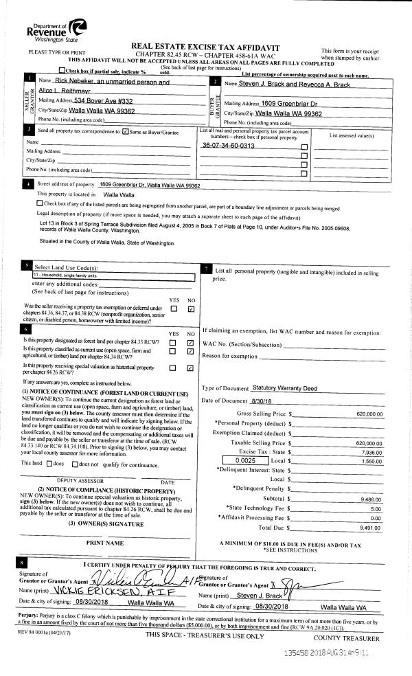 | 2 | 08/31/2018 | SWD | STATUTORY WARRANTY DEED | NEBEKER RICK | BRACK STEVEN J & REBECCA A | | | $620,000.00 | 135458 | 2018-07228 |