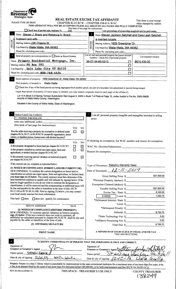 | 1 | 12/13/2019 | SWD | STATUTORY WARRANTY DEED | BRACK STEVEN J & REBECCA A | SETCHELL STEVEN JACKSON & CARA LEAH | | | $637,500.00 | 138249 | 2019-10342 |