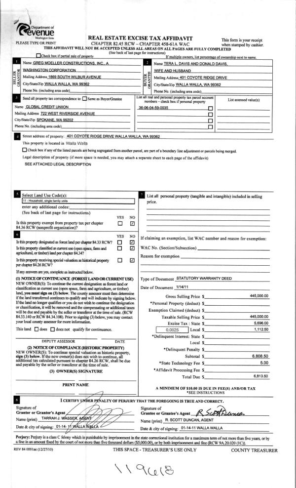 | 3 | 01/19/2011 | WARRANTY D | WARRANTY DEED | GREG MOELLER CONSTRUCTION INC | DAVIS, DONALD & TERA L | | | $445,000.00 | 119618 | 2011-00595 |