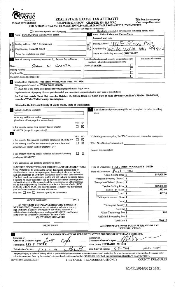 | 2 | 08/11/2014 | SWD | STATUTORY WARRANTY DEED | NOVAK DAWN M | MORO RICHARD & CHELSEA | | | $187,000.00 | 126431 | 2014-05772 |