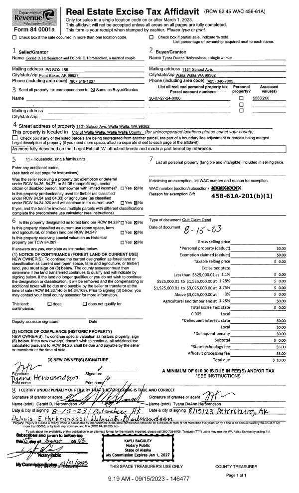 | 1 | 09/15/2023 | QCD | QUIT CLAIM DEED | HERBRANDSON GERALD D & DELORIS E | HERBRANDSON TYANA DEANN | | | | 146477 | 2023-05380 |
