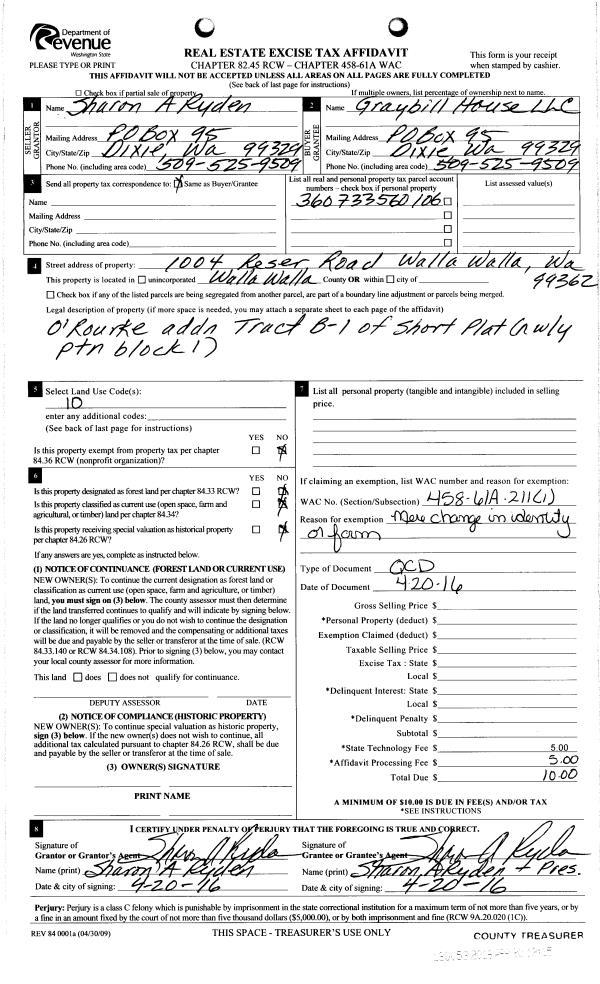 | 2 | 04/20/2016 | QCD | QUIT CLAIM DEED | RYDEN SHARON A | GRAYBILL HOUSE LLC | | | | 130053 | 2016-02878 |