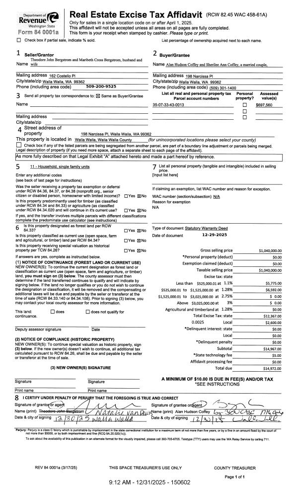 | 1 | 12/31/2025 | SWD | STATUTORY WARRANTY DEED | BERGSTROM THEODORE JOHN | COFFEY ALAN HUDSON & SHERILEE ANN | | | $1,040,000.00 | 150602 | 2025-08035 |