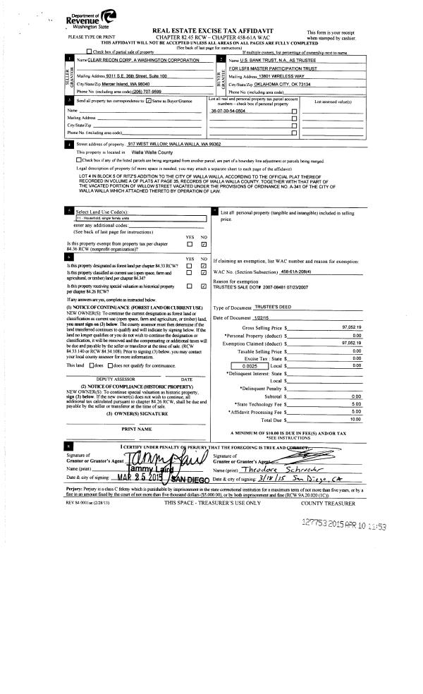 | 2 | 04/10/2015 | TRUSTEES D | TRUSTEE'S DEED | MICKELSON JANETTE M | US BANK TRUST NA | | | $97,052.00 | 127753 | 2015-02906 |