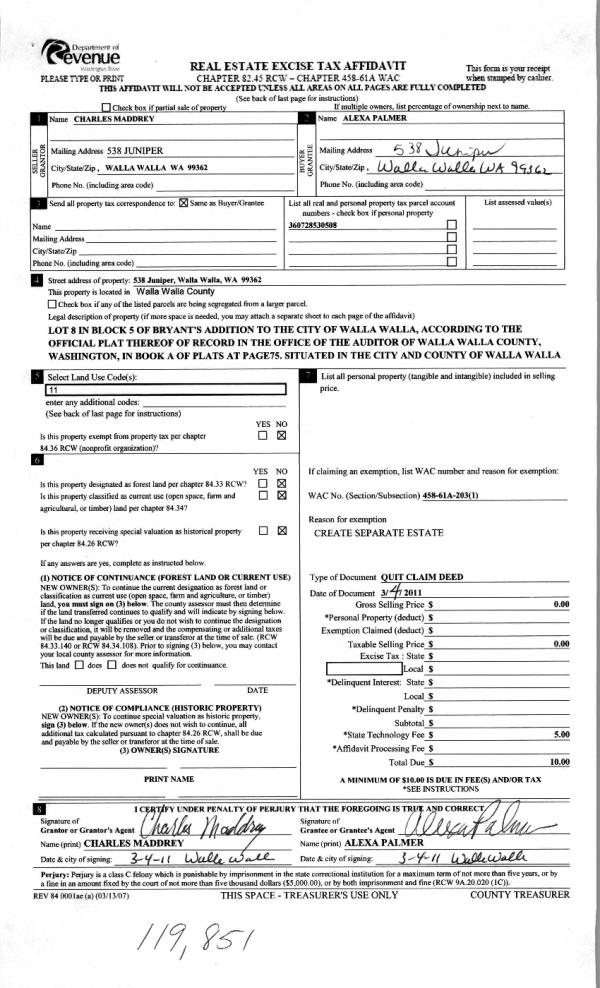 | 4 | 03/07/2011 | QCD | QUIT CLAIM DEED | MADDREY, CHARLES | PALMER, ALEXA | | | | 119851 | 2011-02063 |