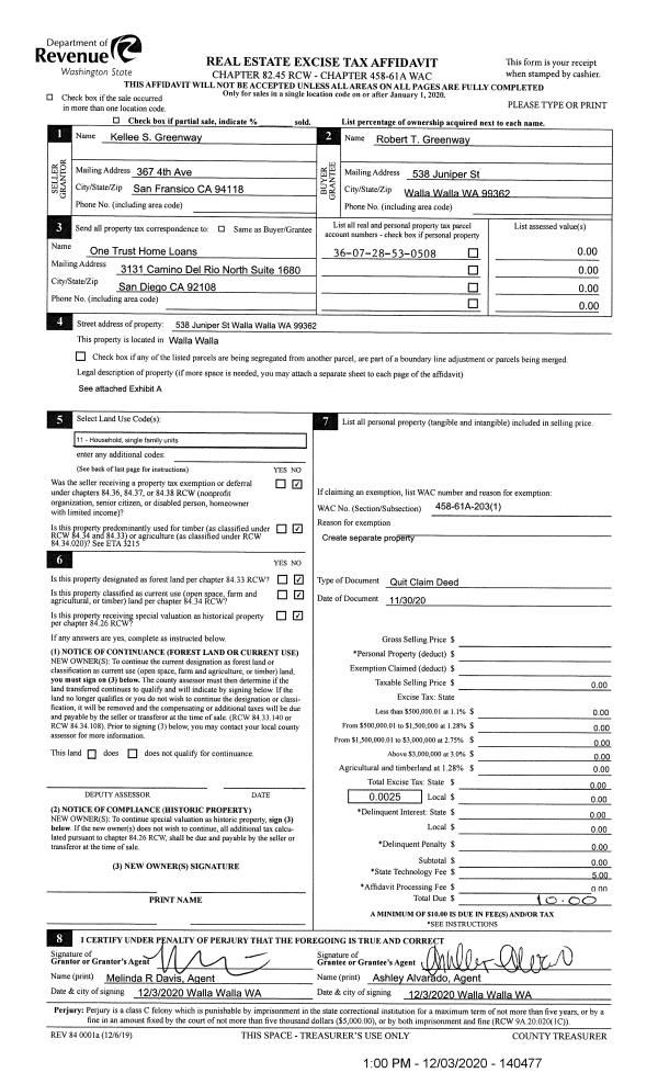 | 1 | 12/03/2020 | QCD | QUIT CLAIM DEED | GREENWAY KELLEE | GREENWAY ROBERT T | | | | 140477 | 2020-12787 |