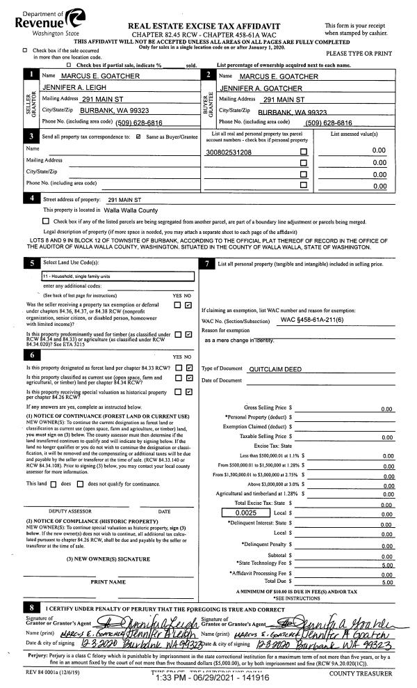 | 2 | 12/03/2020 | QCD | QUIT CLAIM DEED | GOATCHER MARCUS | | | | | 141910 | |