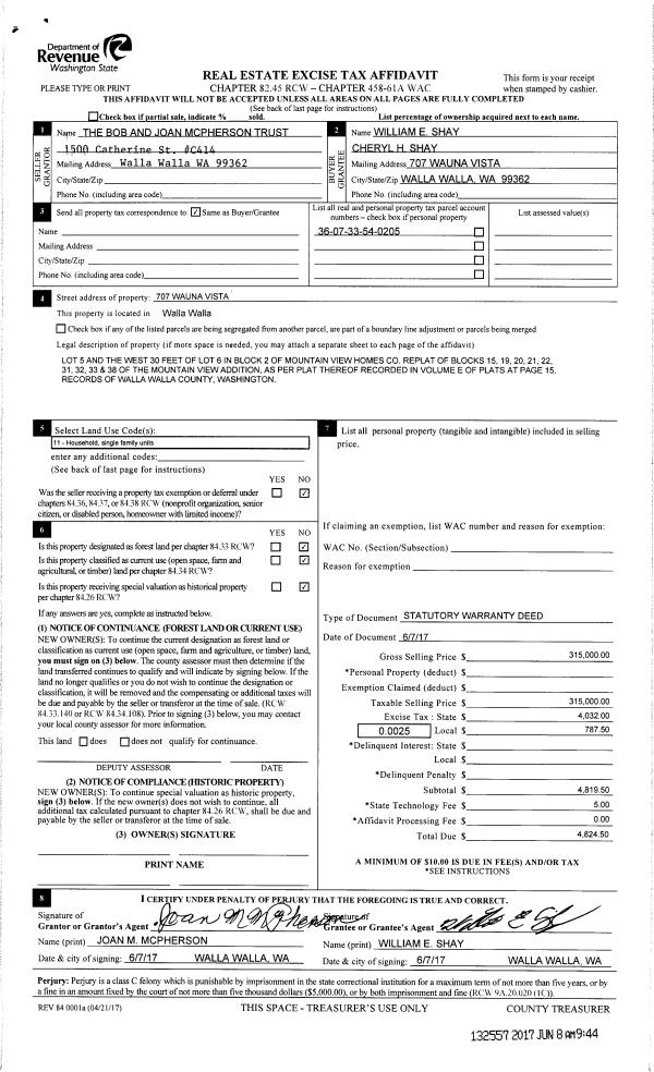 | 1 | 06/08/2017 | SWD | STATUTORY WARRANTY DEED | MC PHERSON ROBERT D TRUSTEE OF THE | SHAY WILLIAM E & CHERYL H | | | $315,000.00 | 132557 | 2017-04364 |