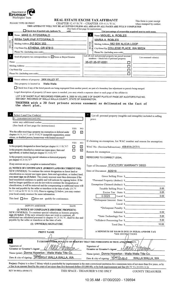 | 1 | 07/30/2020 | WARRANTY D | WARRANTY DEED | FITZGERALD MIKE D & REBA DARLENE | ROBLES MIGUEL A & MARIA A | | | | 139594 | 2020-07351 |