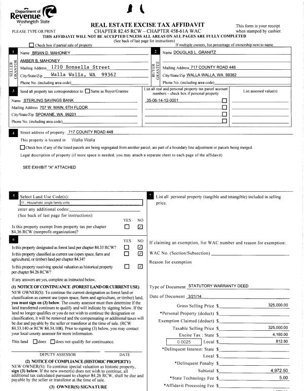 | 2 | 03/24/2014 | WARRANTY D | WARRANTY DEED | MAHONEY BRIAN D & AMBER B | GRANITZ DOUGLAS L | | | $325,000.00 | 125608 | 2014-01988 |