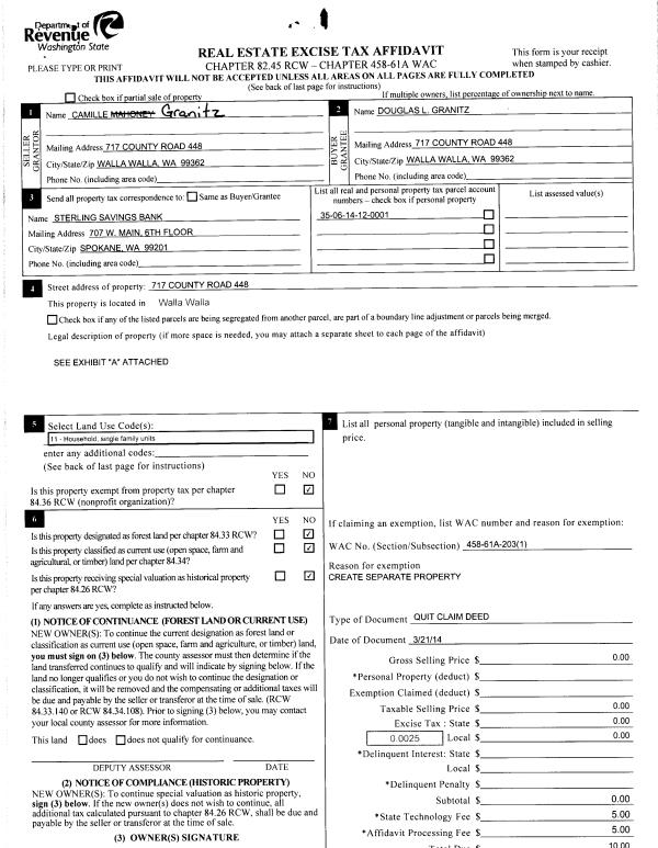 | 1 | 03/24/2014 | QCD | QUIT CLAIM DEED | | GRANITZ DOUGLAS L | | | | 125609 | 2014-01989 |