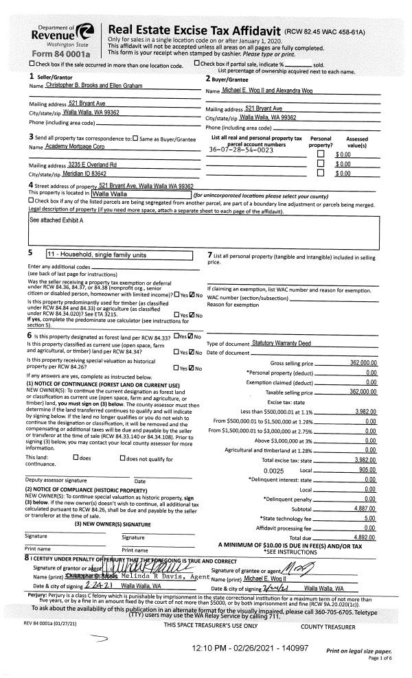 | 1 | 02/26/2021 | SWD | STATUTORY WARRANTY DEED | BROOKS CHRISTOPHER B & ELLEN GRAHAM | WOG MICHAEL E II & ALEXANDRA | | | $362,000.00 | 140997 | 2021-02249 |