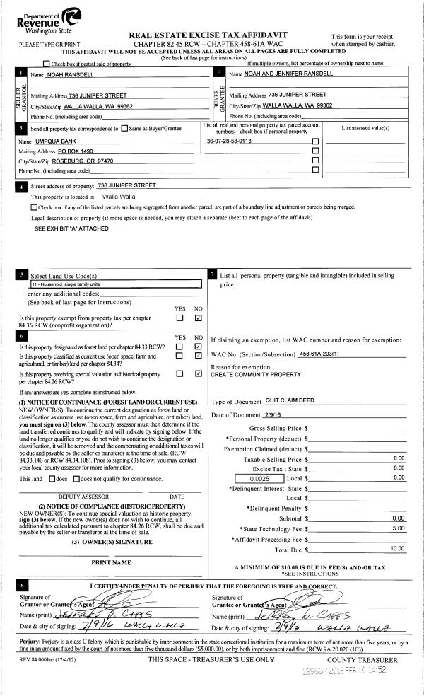 | 3 | 02/08/2016 | QCD | QUIT CLAIM DEED | RANSDELL JENNIFER | RANSDELL NOAH WESLEY | | | | 129644 | 2016-00963 |