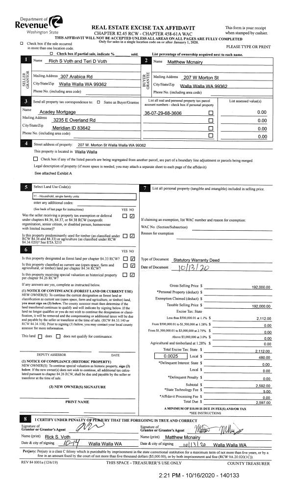 | 1 | 10/16/2020 | SWD | STATUTORY WARRANTY DEED | VOTH RICK & TERI | MCNAIRY MATTHEW | | | $192,000.00 | 140133 | 2020-10755 |