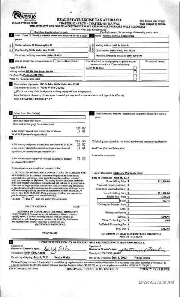 | 3 | 07/02/2013 | WARRANTY D | WARRANTY DEED | GEISSEL, TYSON G | AUSTIN, PATRICIA | | | $121,500.00 | 124230 | 2013-06612 |