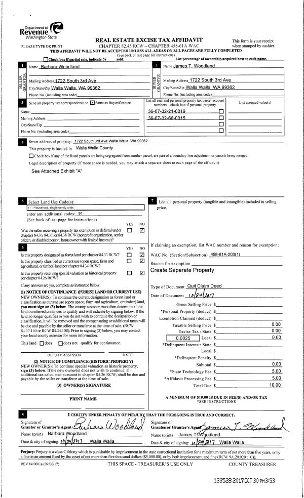 | 1 | 10/24/2017 | QCD | QUIT CLAIM DEED | WOODLAND JAMES & BARBARA | WOODLAND JAMES T | | | $0.00 | 133528 | 2017-08749 |