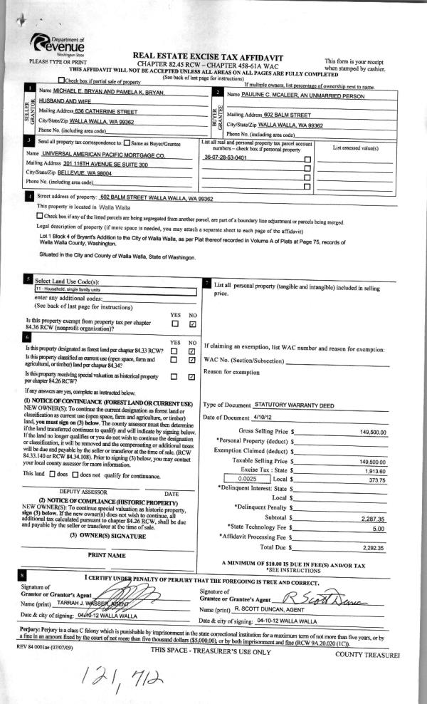 | 4 | 04/25/2012 | WARRANTY D | WARRANTY DEED | BRYAN, MICHAEL E & PAMELA K | MC ALEER, PAULINE C | | | $149,500.00 | 121712 | 2012-03298 |