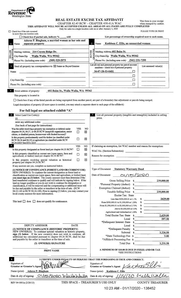 | 1 | 01/17/2020 | SWD | STATUTORY WARRANTY DEED | BINGHAM ADOREE P | ELLIS KATHLEEN C | | | $239,000.00 | 138452 | 2020-00490 |