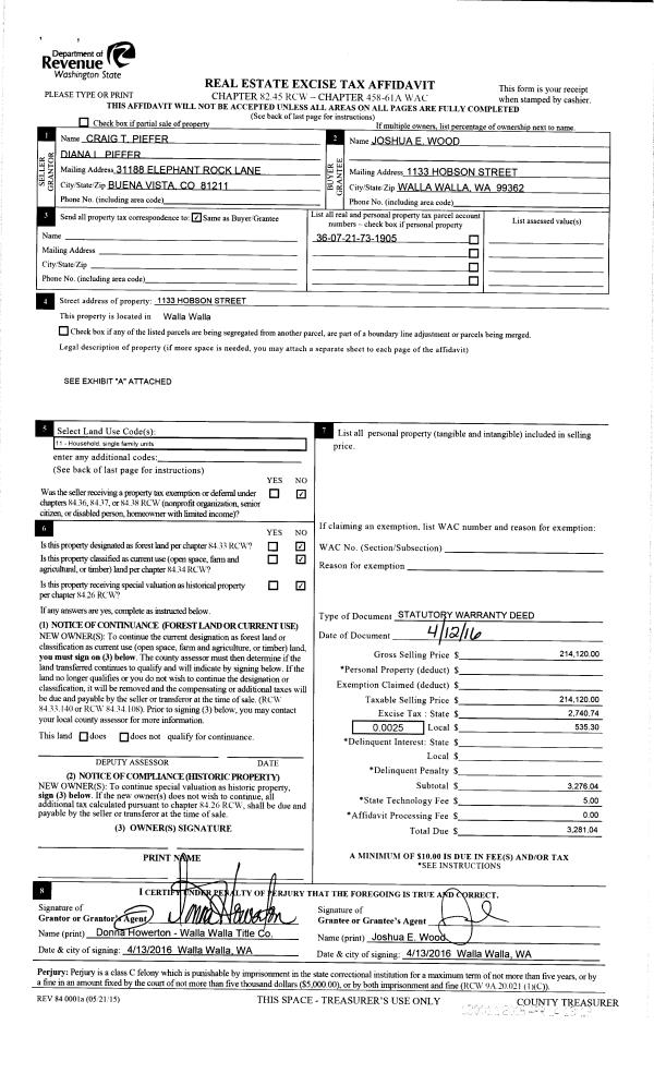 | 2 | 04/14/2016 | SWD | STATUTORY WARRANTY DEED | PIEFER CRAIG T & DIANA L | WOOD JOSHUA E | | | $214,120.00 | 130011 | 2016-02699 |