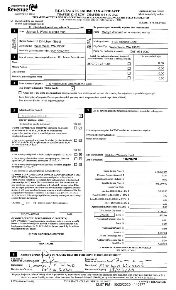 | 1 | 10/23/2020 | SWD | STATUTORY WARRANTY DEED | WOOD JOSHUA E | WINNARD MARILYN | | | $345,000.00 | 140177 | 2020-11056 |