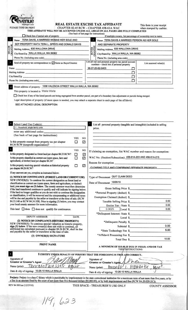 | 1 | 01/20/2011 | QCD | QUIT CLAIM DEED | SPRYS, TERA L (NKA TERA DAVIS) | DAVIS, TERA | | | | 119623 | 2011-00634 |