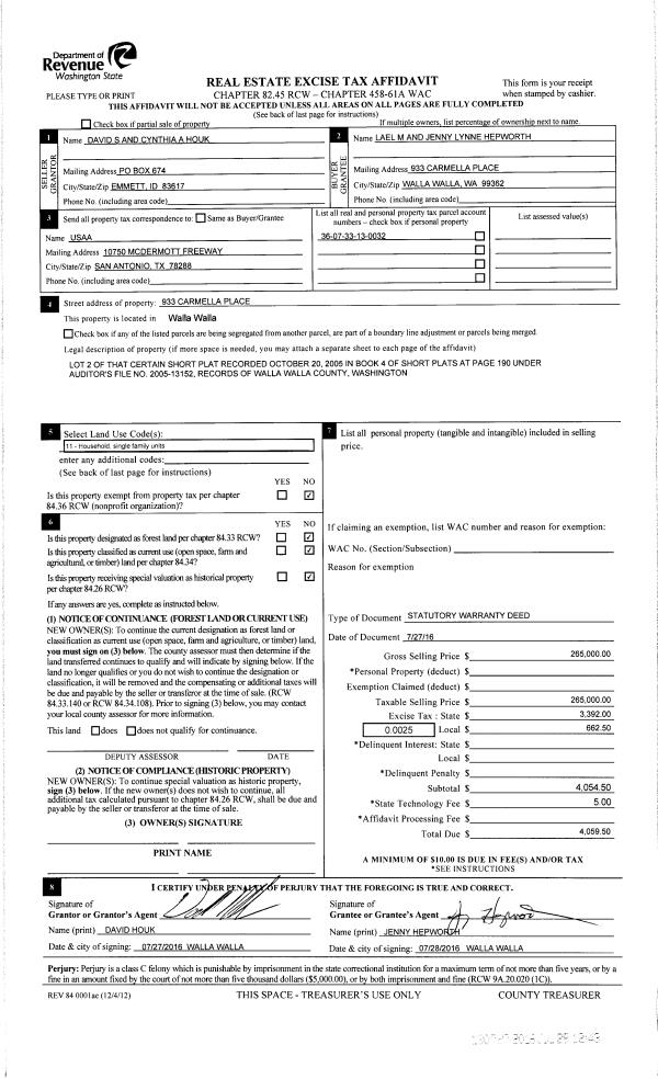 | 2 | 07/29/2016 | SWD | STATUTORY WARRANTY DEED | HOUK DAVID S & CYNTHIA A | HEPWORTH LAEL M & JENNY LYNNE | | | $265,000.00 | 130727 | 2016-05969 |