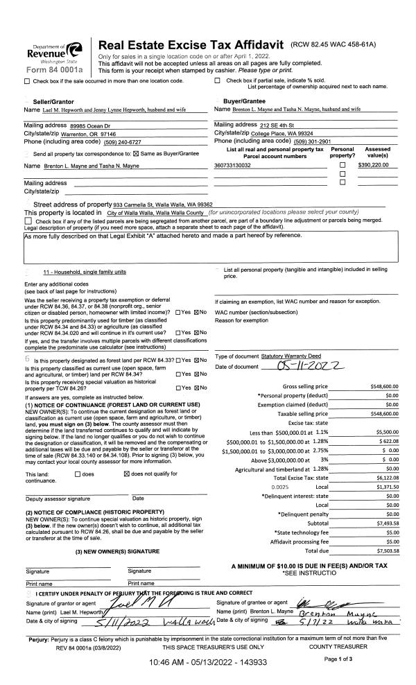 | 1 | 05/13/2022 | SWD | STATUTORY WARRANTY DEED | HEPWORTH LAEL M & JENNY LYNNE | MAYNE BRENTON L & TASHA N | | | $548,600.00 | 143933 | 2022-04080 |