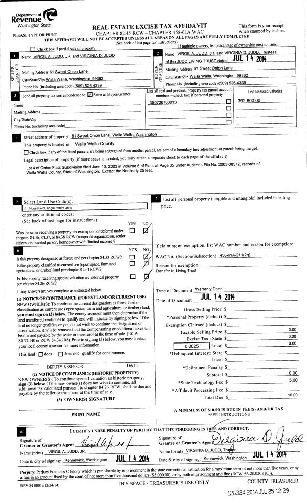 | 2 | 07/25/2014 | WARRANTY D | WARRANTY DEED | JUDD VIRGIL A JR & VIRGINIA D | JUDD LIVING TRUST | | | $0.00 | 126324 | 2014-05268 |