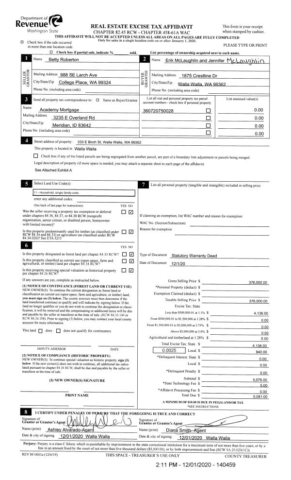 | 1 | 12/01/2020 | SWD | STATUTORY WARRANTY DEED | ROBERTON BETTY J | MCLAUGHLIN ERIK & JENNIFER | | | $376,000.00 | 140459 | 2020-12668 |
