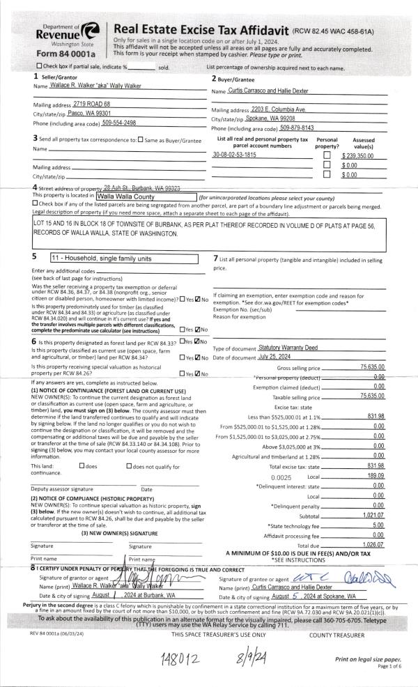 | 1 | 08/09/2024 | SWD | STATUTORY WARRANTY DEED | WALKER WALLY | CARRASCO CURTIS & HALLIE DEXTER | | | $75,635.00 | 148012 | 2024-04414 |