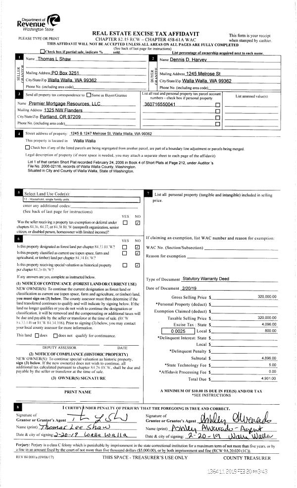 | 1 | 02/20/2019 | SWD | STATUTORY WARRANTY DEED | SHAW THOMAS L | HARVEY DENNIS D | | | $320,000.00 | 136411 | 2019-01114 |