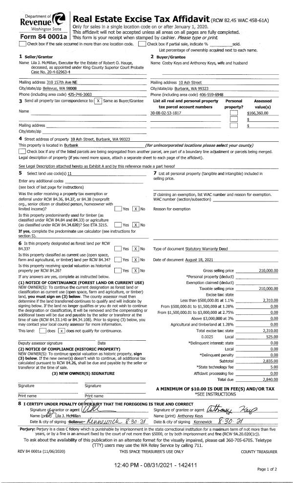 | 1 | 08/31/2021 | SWD | STATUTORY WARRANTY DEED | HAUGE ROBERT ORVIN ESTATE OF | KEYS COSBY & ANTHONEY | | | $210,000.00 | 142411 | 2021-10748 |