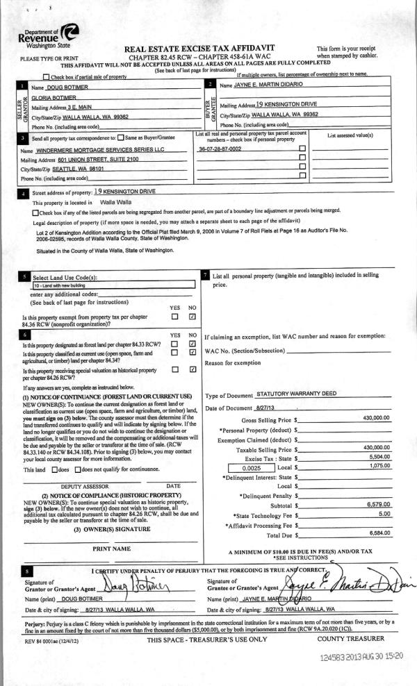 | 2 | 08/30/2013 | WARRANTY D | WARRANTY DEED | BOTIMER, DOUGLAS A & GLORIA | DIDARIO, JAYNE E MARTIN | | | $430,000.00 | 124583 | 2013-08995 |
