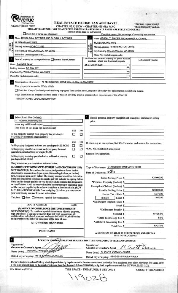 | 2 | 09/17/2010 | WARRANTY D | WARRANTY DEED | BOTIMER, DOUGLAS A & GLORIA | SNIDER, KENDAL T | | | $420,000.00 | 119028 | 2010-07360 |