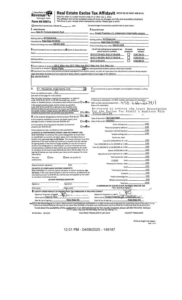 | 1 | 04/08/2025 | QCD | QUIT CLAIM DEED | POND KEVIN W & JOLENE B | PONDART PROPERTIES LLC | | | | 149187 | 2025-01842 |