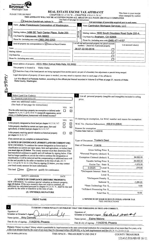 | 5 | 11/08/2016 | TRUSTEES D | TRUSTEE'S DEED | DUE LILLIAN M | CARRINGTON MORTGAGE SERVICES LLC | | | $84,000.00 | 131402 | 2016-09290 |