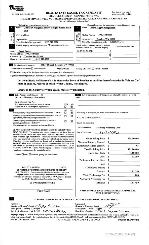 | 1 | 11/15/2018 | SWD | STATUTORY WARRANTY DEED | WRIGHT JEFFREY D | JAGGER BRENT | | | $125,000.00 | 135946 | 2018-09477 |