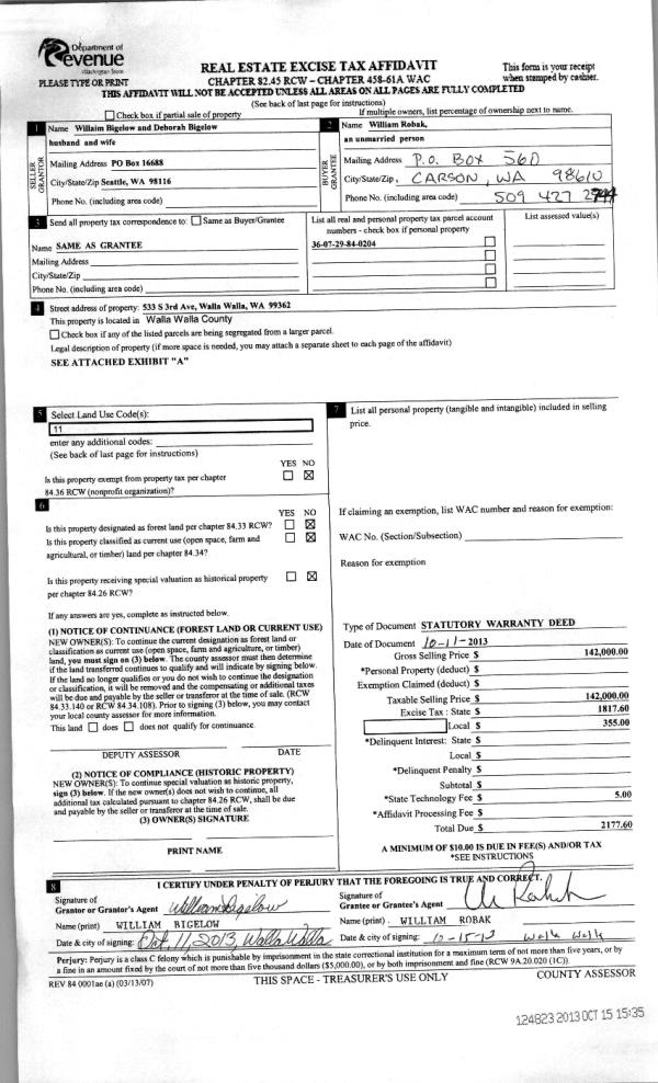 | 3 | 10/15/2013 | WARRANTY D | WARRANTY DEED | BIGELOW WILLIAM & DEBORAH | ROBAK WILLIAM MICHAEL ESTATE OF | | 2-PARCELS | $142,000.00 | 124823 | 2013-10394 |
