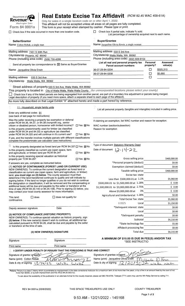 | 1 | 12/21/2022 | SWD | STATUTORY WARRANTY DEED | ROBAK COLTON | ERWIN JACQUELINE OLIVIA | | 2-PARCELS | $460,000.00 | 145168 | 2022-09825 |