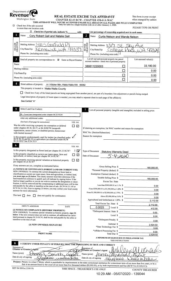 | 1 | 05/07/2020 | SWD | STATUTORY WARRANTY DEED | GALL CORY & NATALIE | NELSON CURTIS & WANDA | | | $165,000.00 | 139044 | 2020-03905 |
