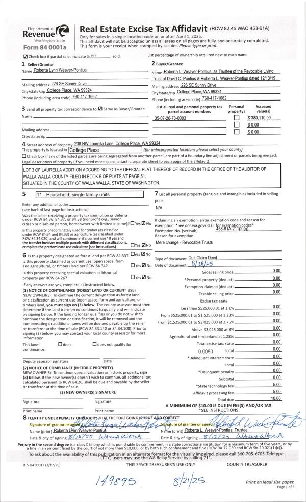 | 1 | 08/21/2025 | QCD | QUIT CLAIM DEED | COLE EDWARD EARL & | COLE EDWARD EARL & REVOCABLE LIVING TRUST DAVID C PONTIUS & | | | | 149895 | 2025-04996 |