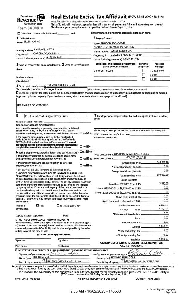 | 2 | 10/02/2023 | SWD | STATUTORY WARRANTY DEED | HANKS ELLEN | COLE EDWARD EARL & | | | $350,000.00 | 146560 | 2023-05751 |