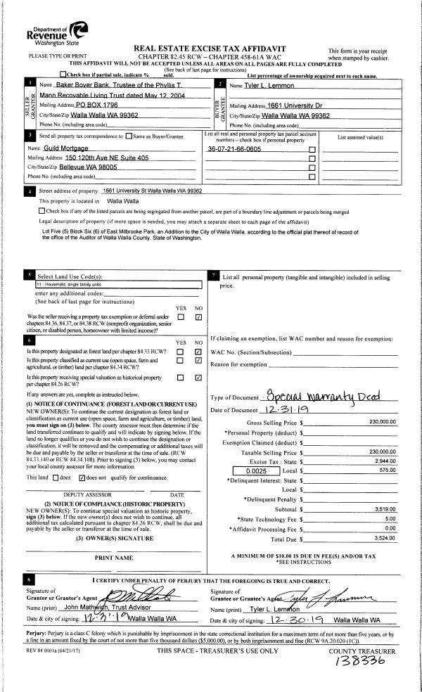 | 1 | 12/31/2019 | SWP | Special Warranty Deed | MANN PHYLLIS T REV LIVING TRUST | LEMMON TYLER L | | | $230,000.00 | 138336 | 2019-10830 |