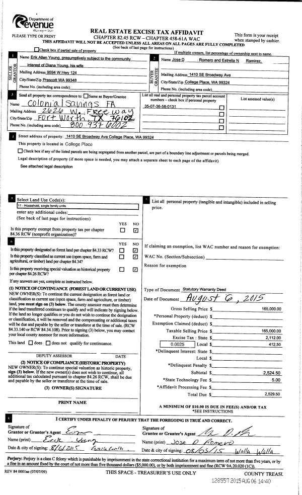 | 1 | 08/06/2015 | SWD | STATUTORY WARRANTY DEED | YOUNG ERIK ALLEN | ROMERO JOSE D | | | $165,000.00 | 128557 | 2015-06816 |