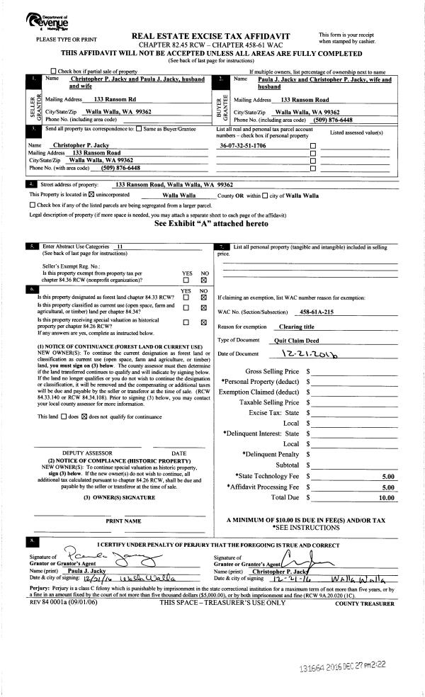 | 1 | 12/21/2016 | QCD | QUIT CLAIM DEED | JACKY CHRISTOPHER P | JACKY CHRISTOPHER P & PAULA J | | | $0.00 | 131664 | 2016-10681 |