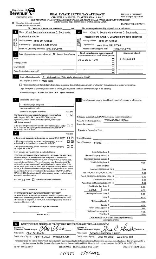 | 1 | 04/19/2022 | SWD | STATUTORY WARRANTY DEED | SOUTHARDS CHAD & ANNA C | SOUTHARDS CHAD A & ANNA C TRUST | | | $0.00 | 143909 | 2022-03960 |